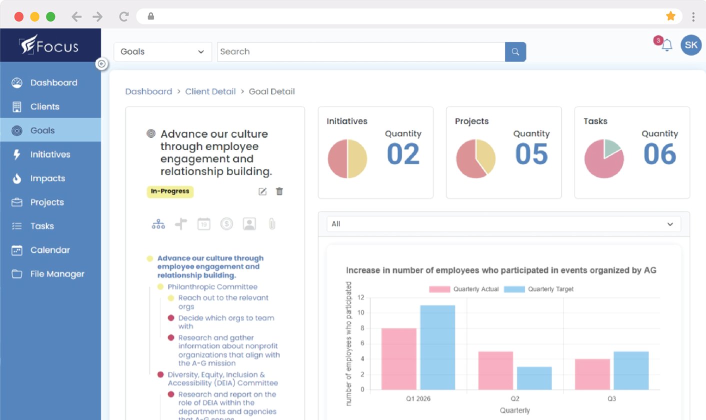 Focus™ consolidates your goals, milestones, and performance data into a single view—so you can spend less time assembling reports and more time delivering outcomes.